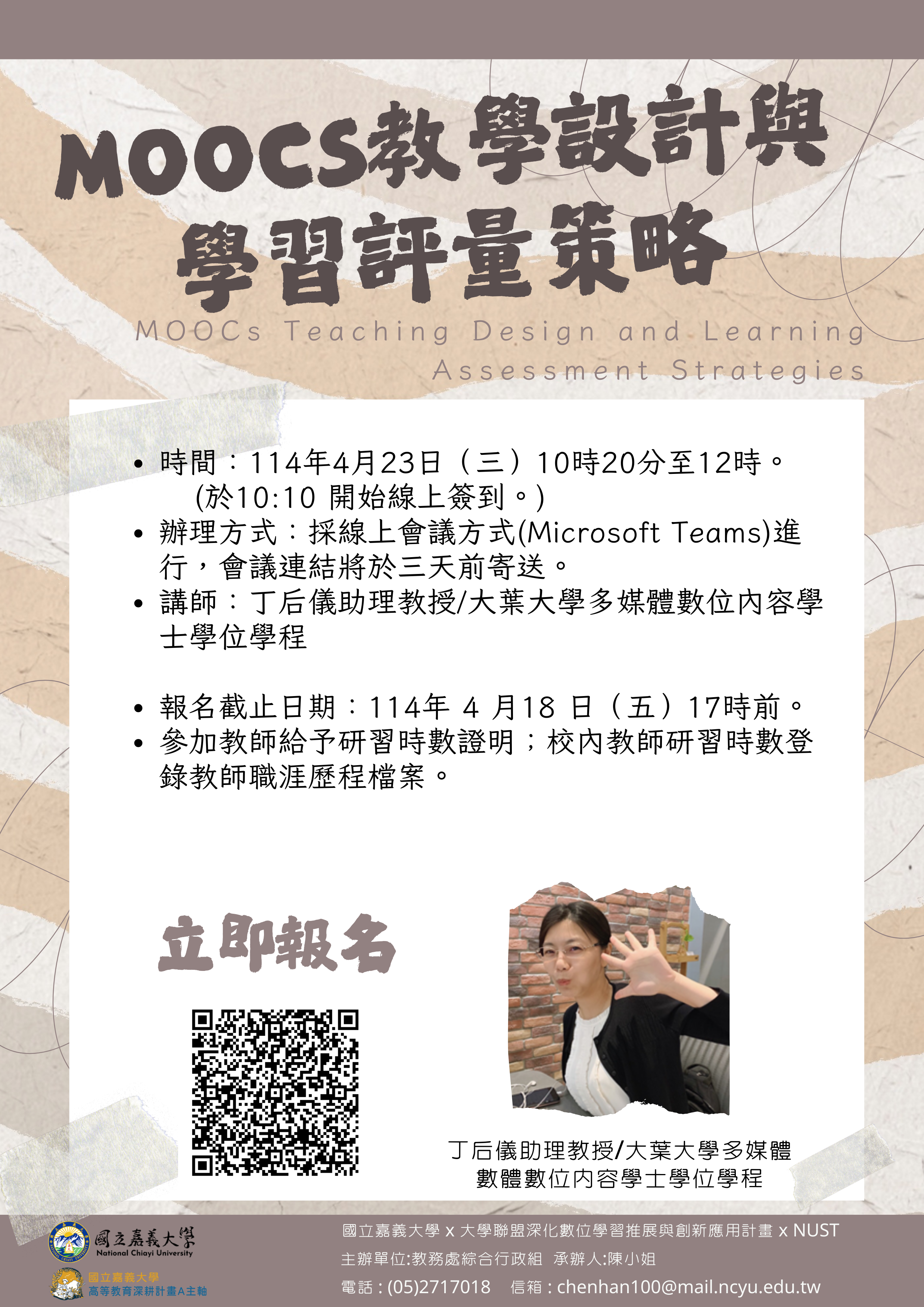 誠摯邀請您參與【MOOCs教學設計與學習評量策略】線上研習活動,邀請 大葉大學 多媒體數位內容學士學位學程 丁后儀助理教授,分享 MOOCs 教學設計與學習評量策略,與您攜手探索數位學習的無限可能!